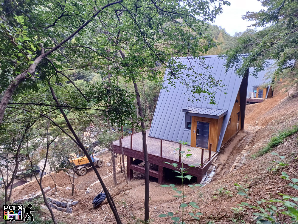 삼각뿔 모양의 펜션? 6동 정도가 지어지고 있었다.